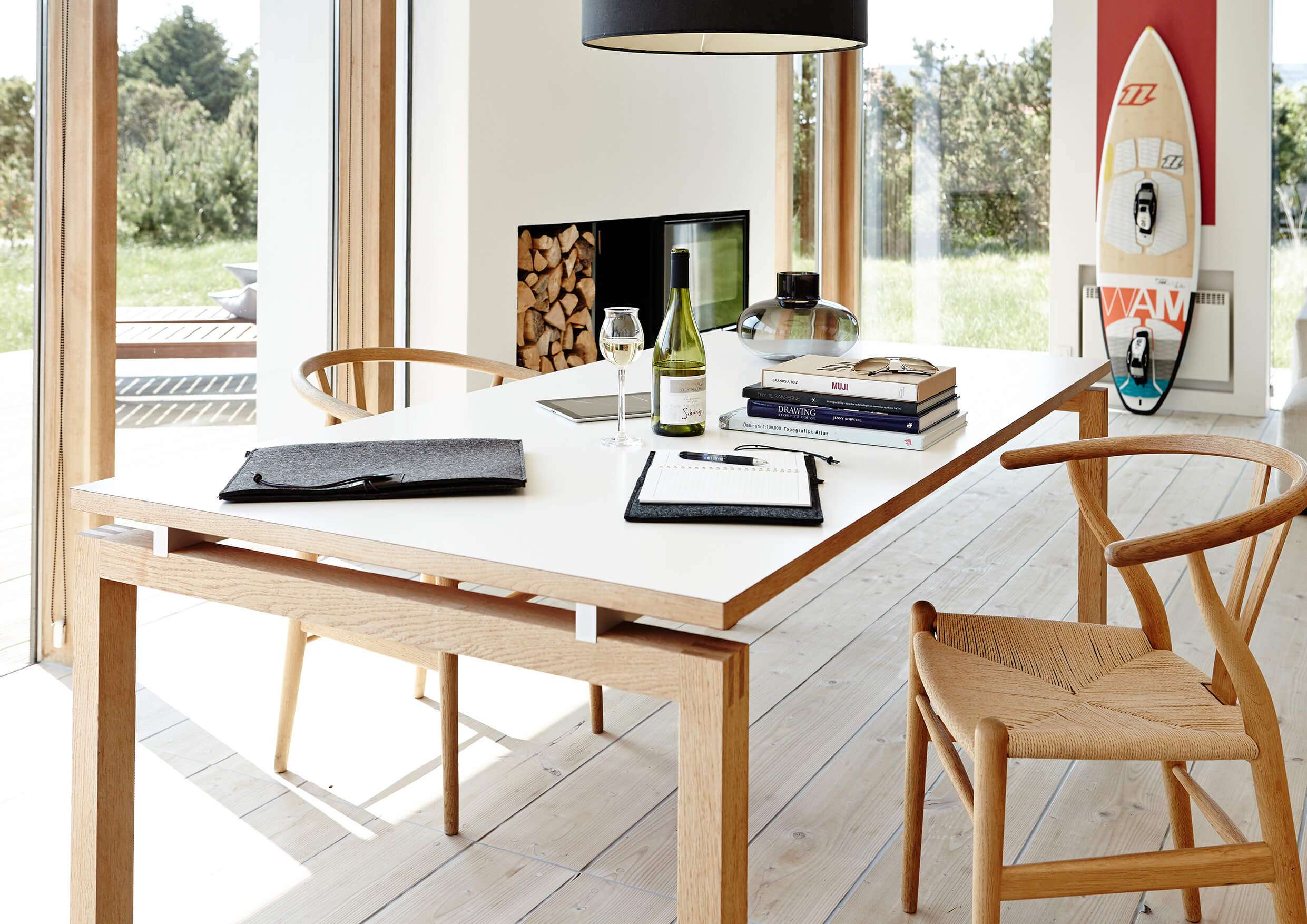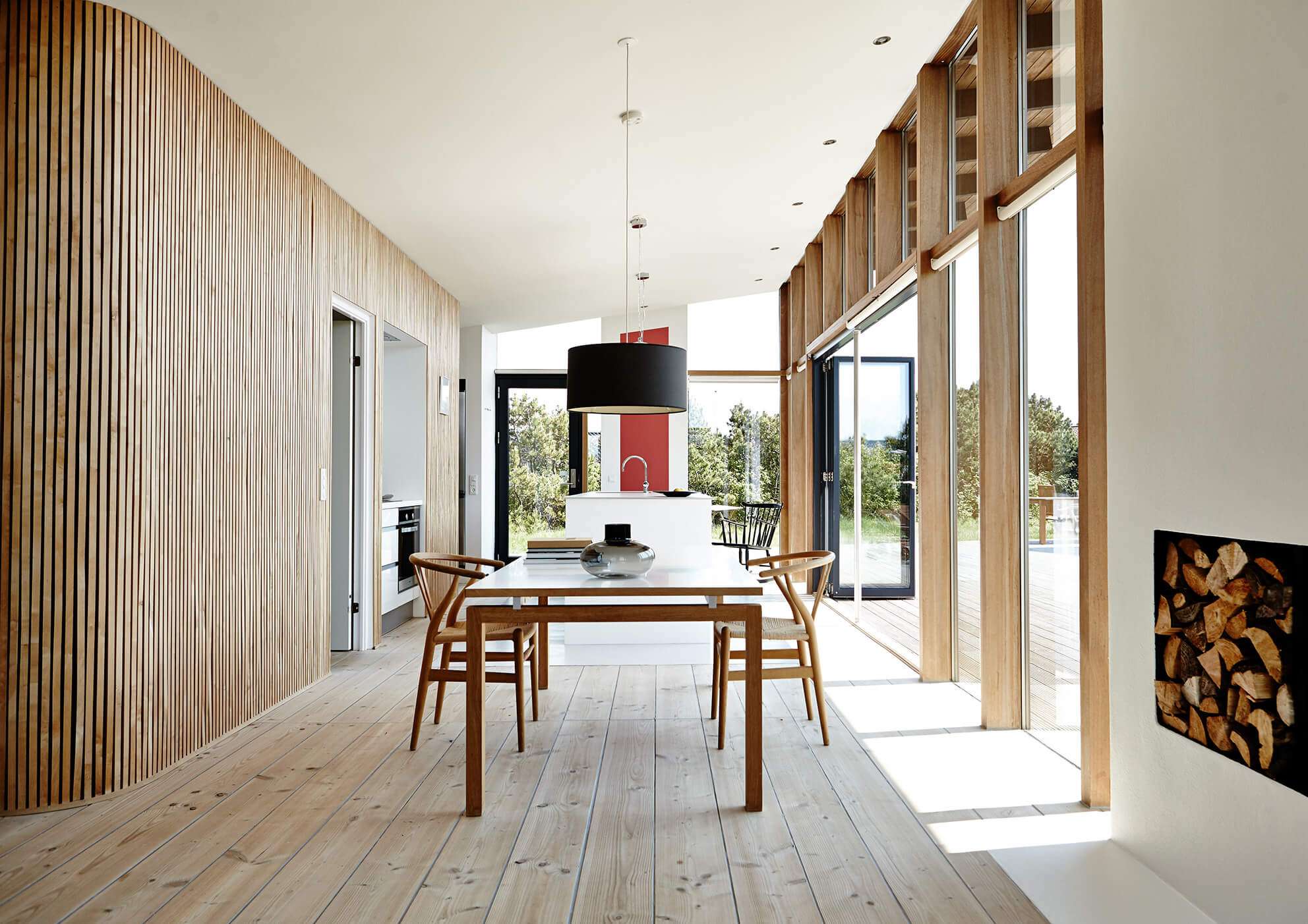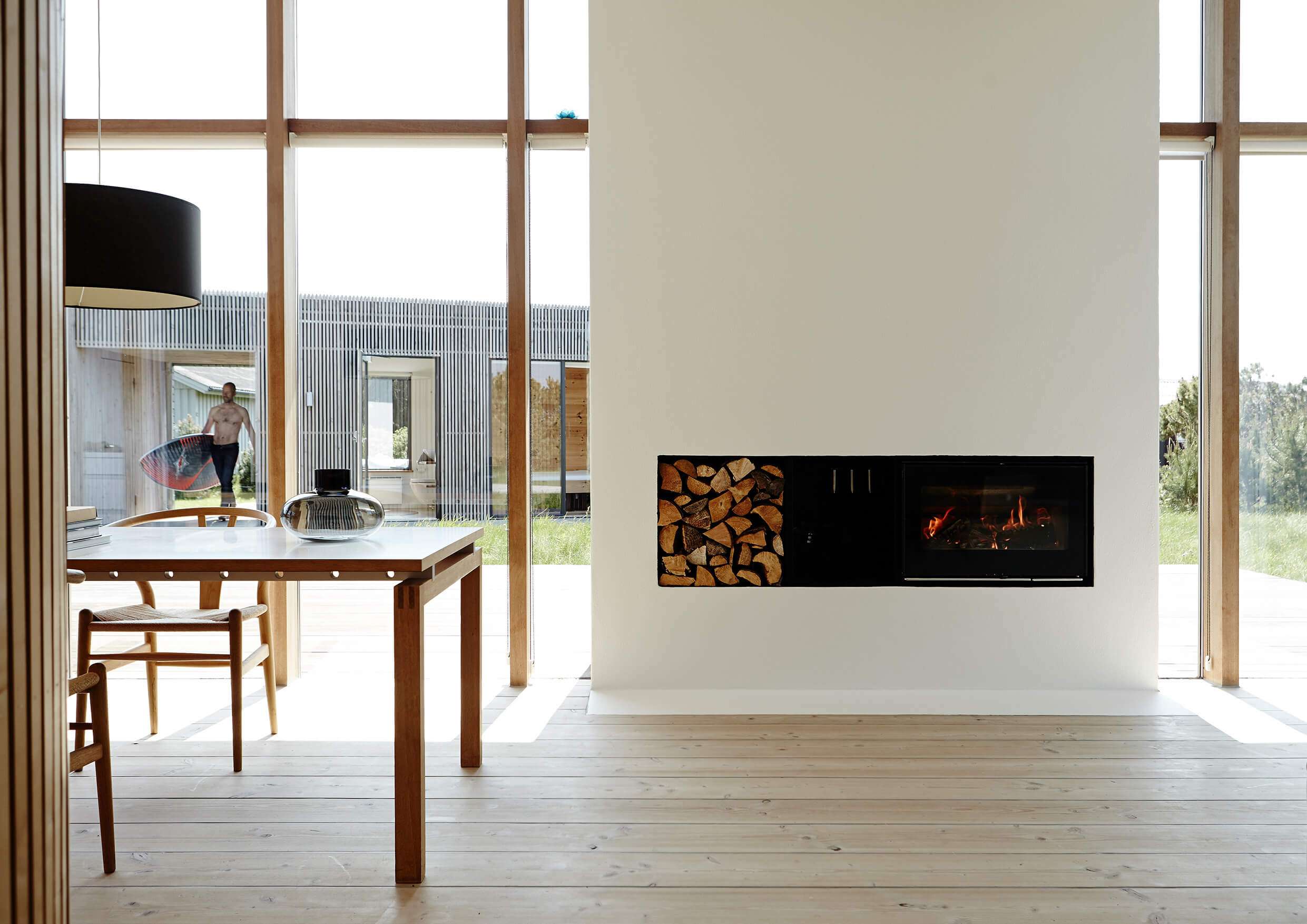House Aavego consists of three parts: an annex with four bedrooms opening directly to a spacious terrace, and a main building with an additional bedroom, an open kitchen, dining area, and living space with a fireplace.